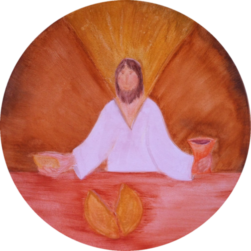 einen Kelch und ein Stück Brot.