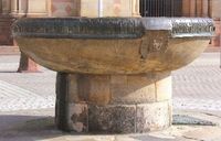Wieder um den ganzen Dom herum laufen zur 1. Station. Dort sieht man einen großen steinernen Kelch: Den Domnapf.