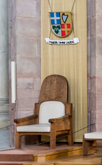 Dieser Stuhl hier ist nur für den Bischof von Speyer: Dr. Karl-Heinz Wiesemann. (Bild zeigen!) Ein Bischof ist Leiter (der Chef) aller katholischen Christen einer bestimmten Region (Diözese oder Bistum). Bei wichtigen Gottesdiensten sitzt der Bischof auf diesem Stuhl.